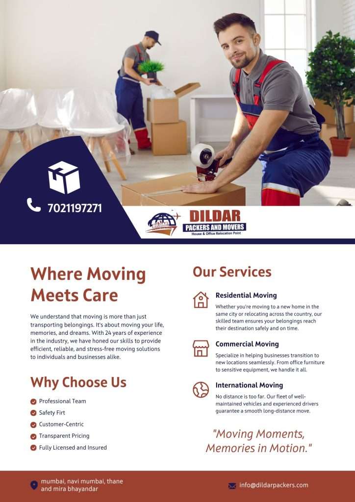 Dildar Packers and Movers is a leading relocation service provider offering reliable and efficient packers and movers services in Mumbai, Navi Mumbai, Thane, and Mira Bhayandar. With years of experience in the industry, we have established ourselves as a trusted name when it comes to moving homes, offices, or businesses.